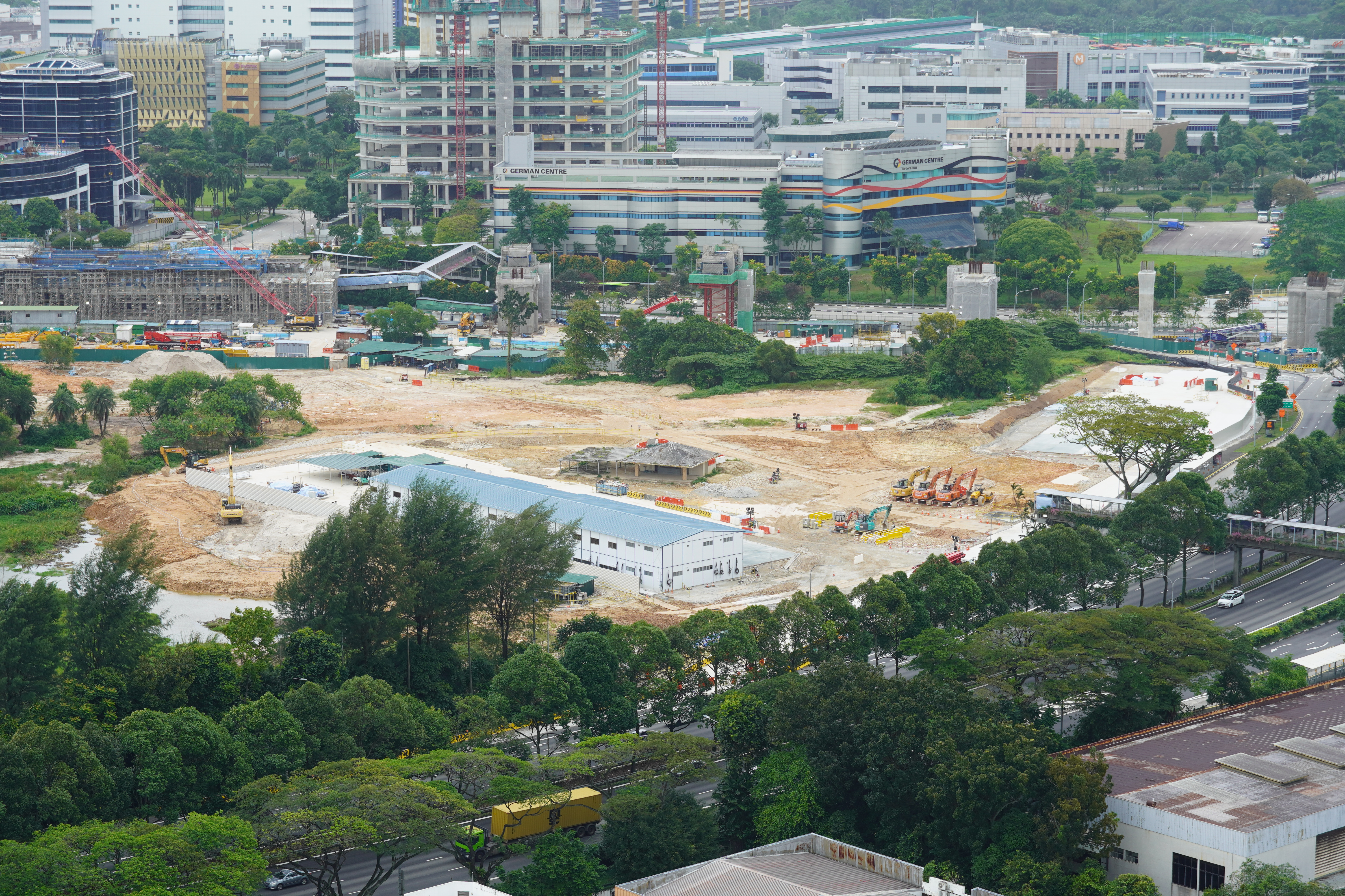 In a nutshell: Site clearing works had advanced at the eastern-most portion of the former Jurong Country Club grounds with site offices being set up here. A segment of hoarding likely separates the contract from neighbouring contract CR211.